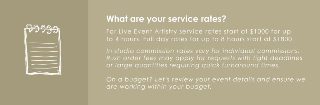 For personalized artistry beyond live events, I offer custom in-studio commissions tailored to your needs. Whether you’re looking for branded gifts, heartfelt keepsakes, or special occasion pieces, each item is thoughtfully designed with care and attention to detail.