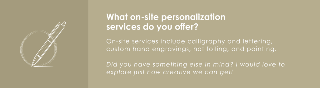 Every detail matters when creating a memorable experience. Whether through hand engraving, calligraphy, hot foiling, or painting, each service adds a personalized touch that elevates events and leaves guests with a lasting keepsake.